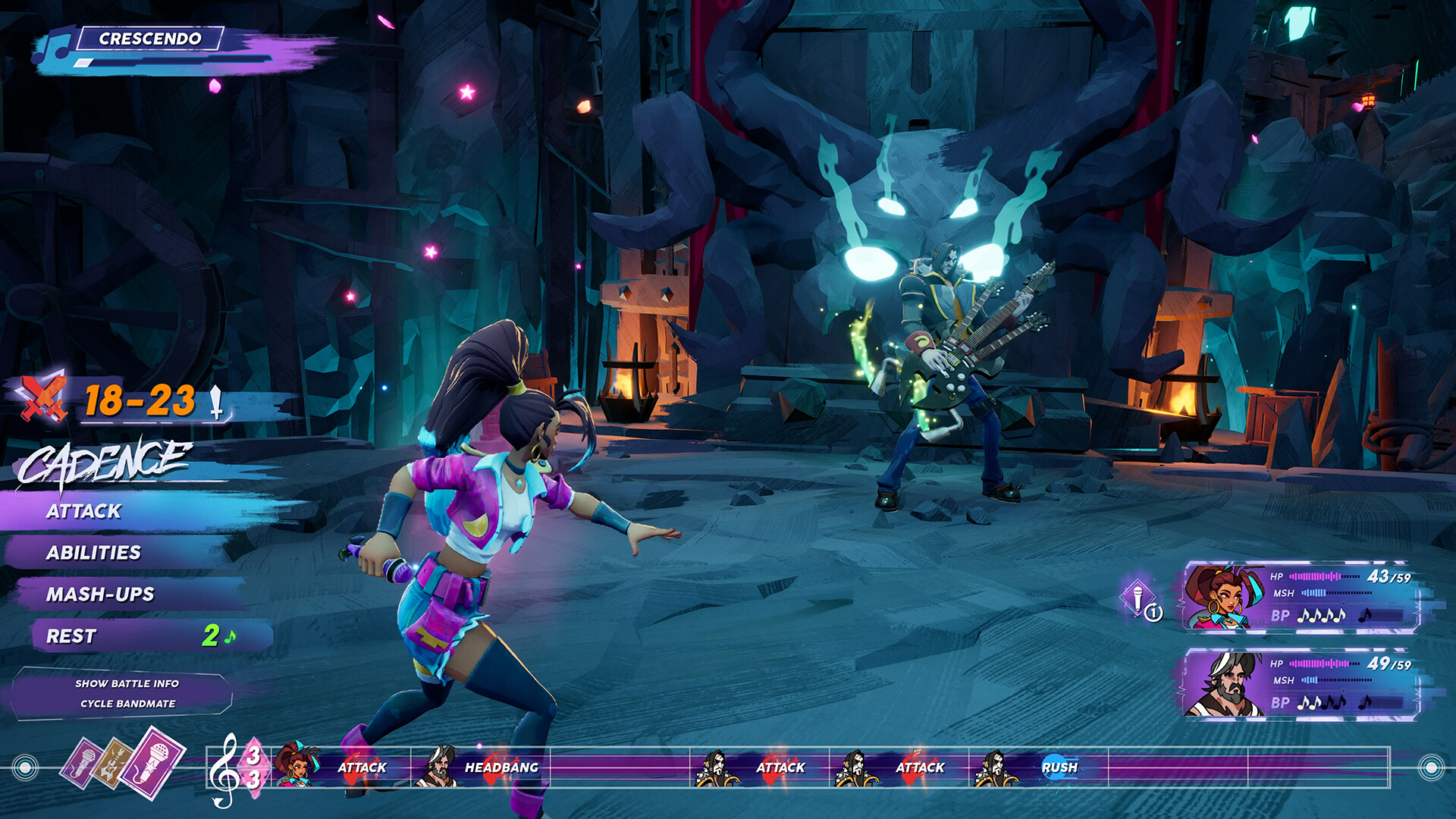 At the begining, you might be thinking that you’re getting yourself into “a totally new kind of turn-based combat,”. In all fairness, however, you’re essentially playing a massive rhythm game stapled to a standard RPG. It works better than it sounds. You step into the shoes of Cadence, a pop singer who tanks a music contest and decides to form a cross-genre supergroup to stop a world-ending event. It’s a standard save-the-world plot, just drenched in neon and glitter.